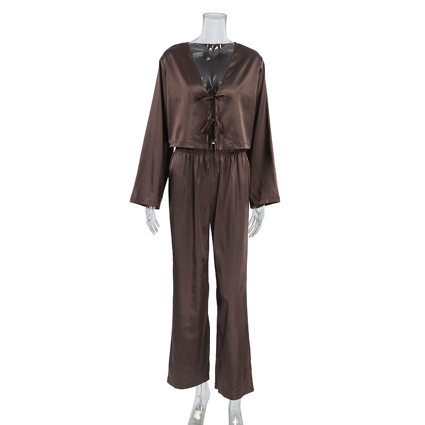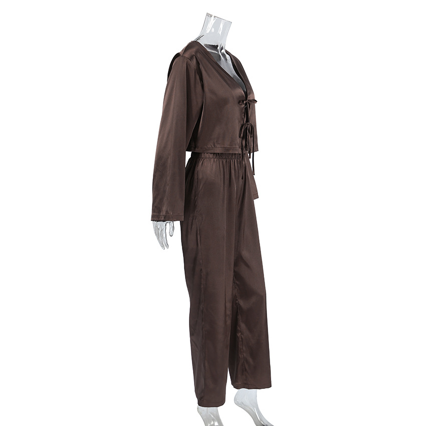 Autumn Artificial Silk Cardigan Lace up Pajamas Two Piece Loose Casual Comfortable Soft Women Homewear