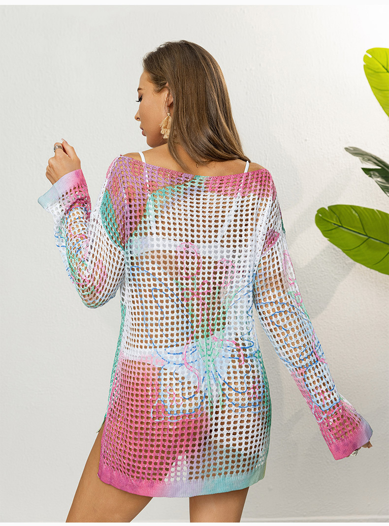 Hollow Out Cutout Sweater Women Seaside Holiday Floral Print Blouse Bikini Cover Up Sun Protection Shirt Loose Top