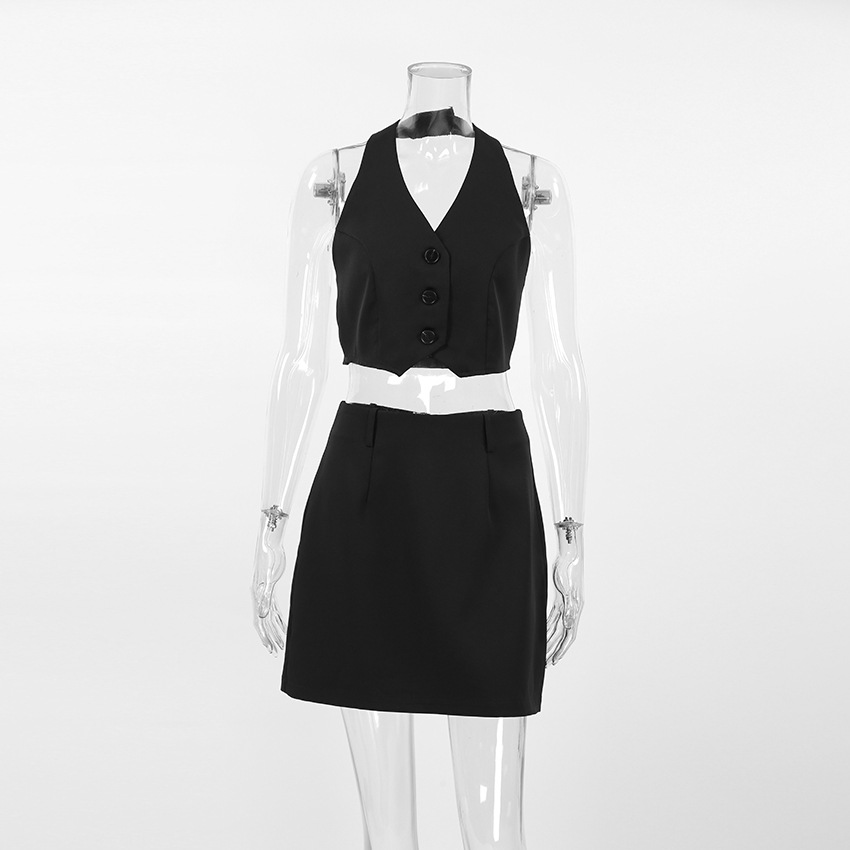 Spring Summer Black Sexy Halter Sleeveless Waistcoat Vest Two Piece Set for Women