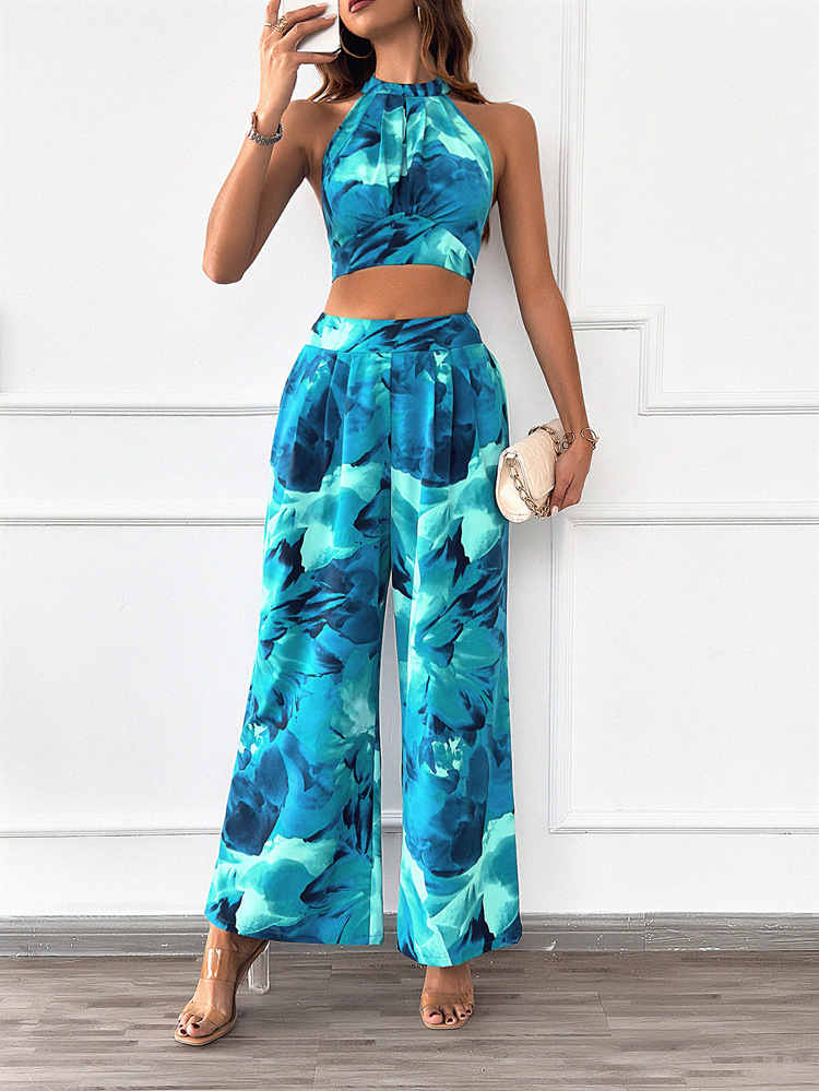 Spring Summer Casual Commuting Vacation Contrast Color Halter Top Wide Leg Pants Set Women