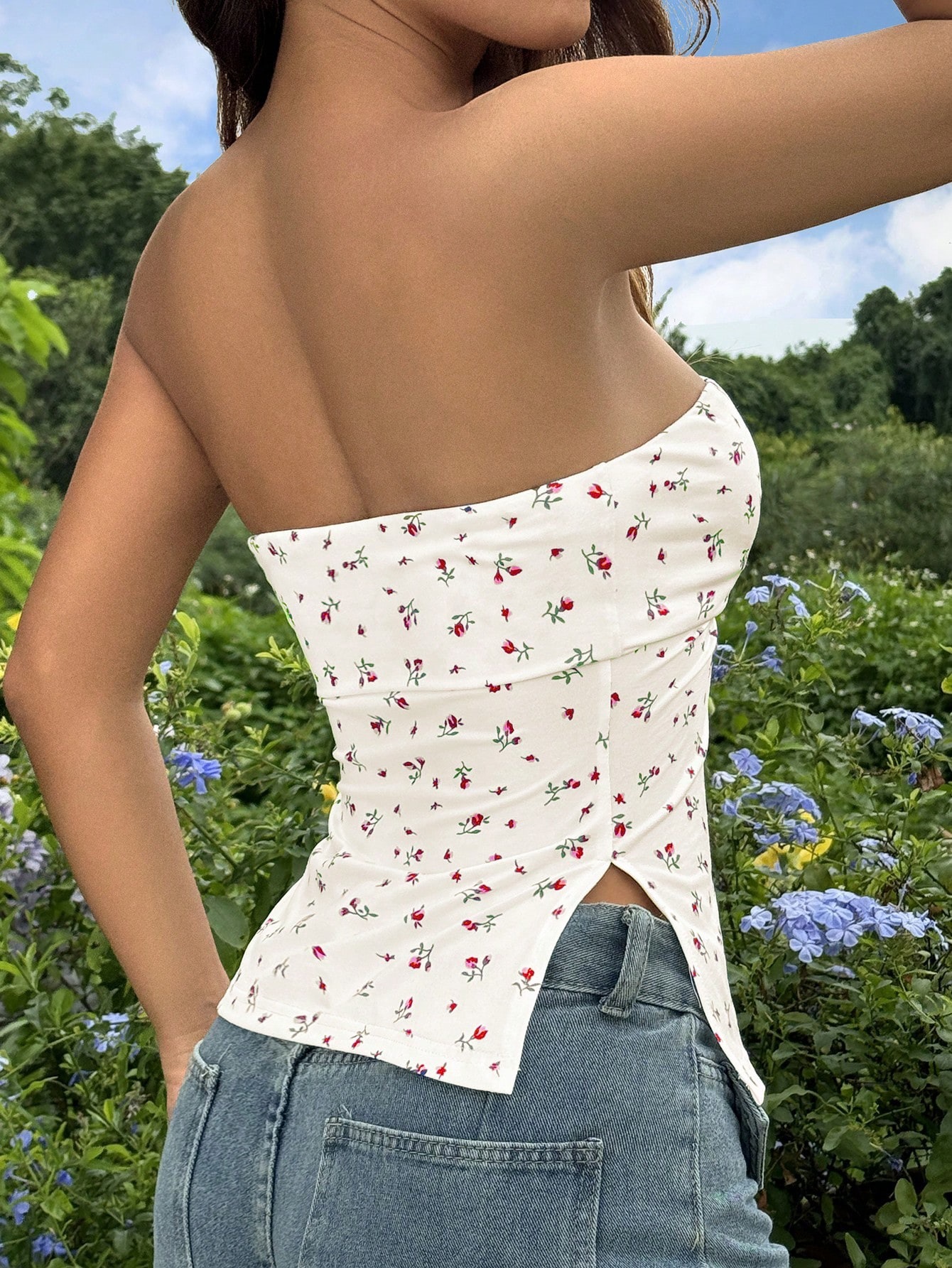 Spring Summer Women Clothing Age Reducing Sweet T shirt Short Floral Strapless Figure Flattering Top