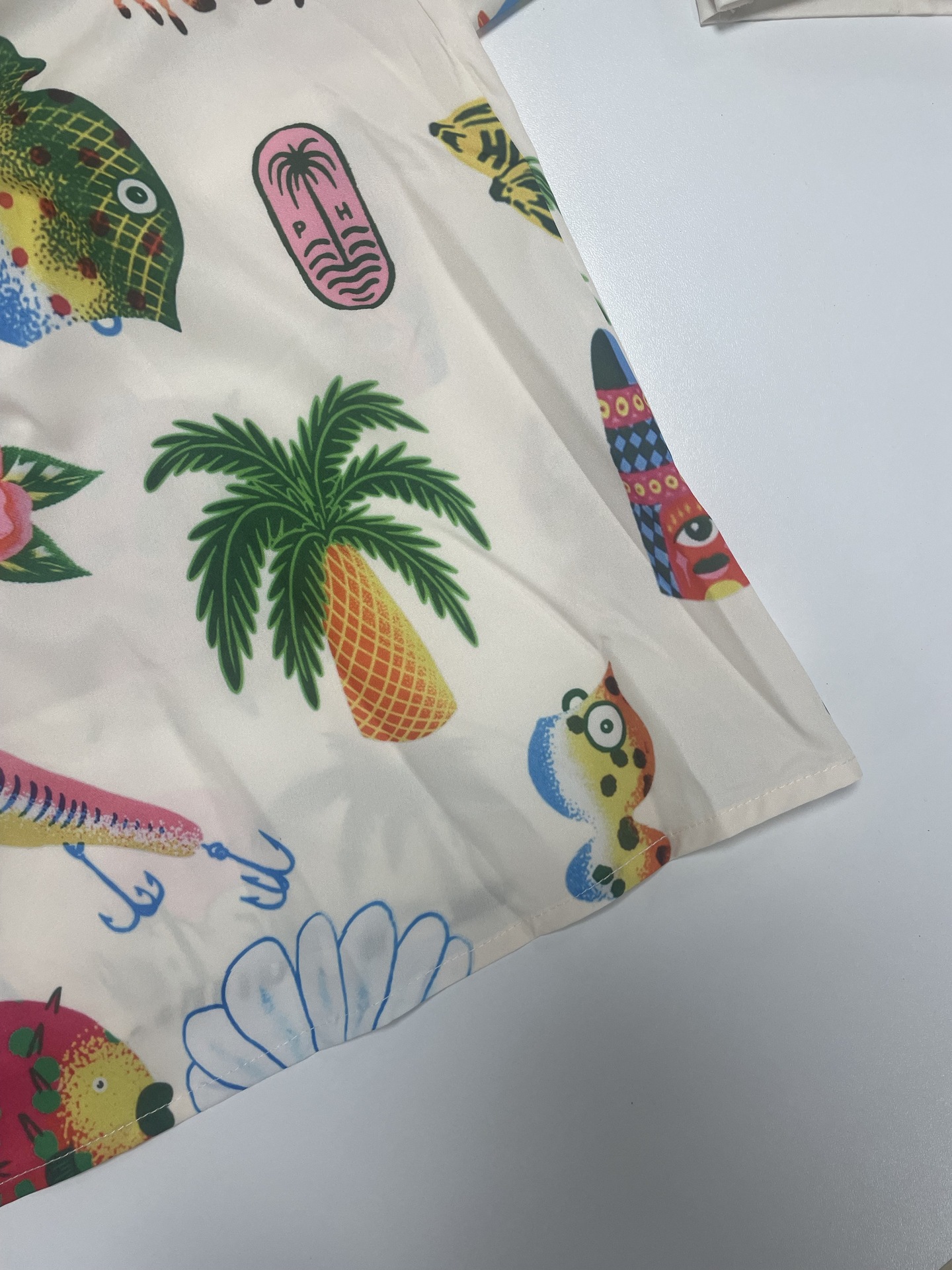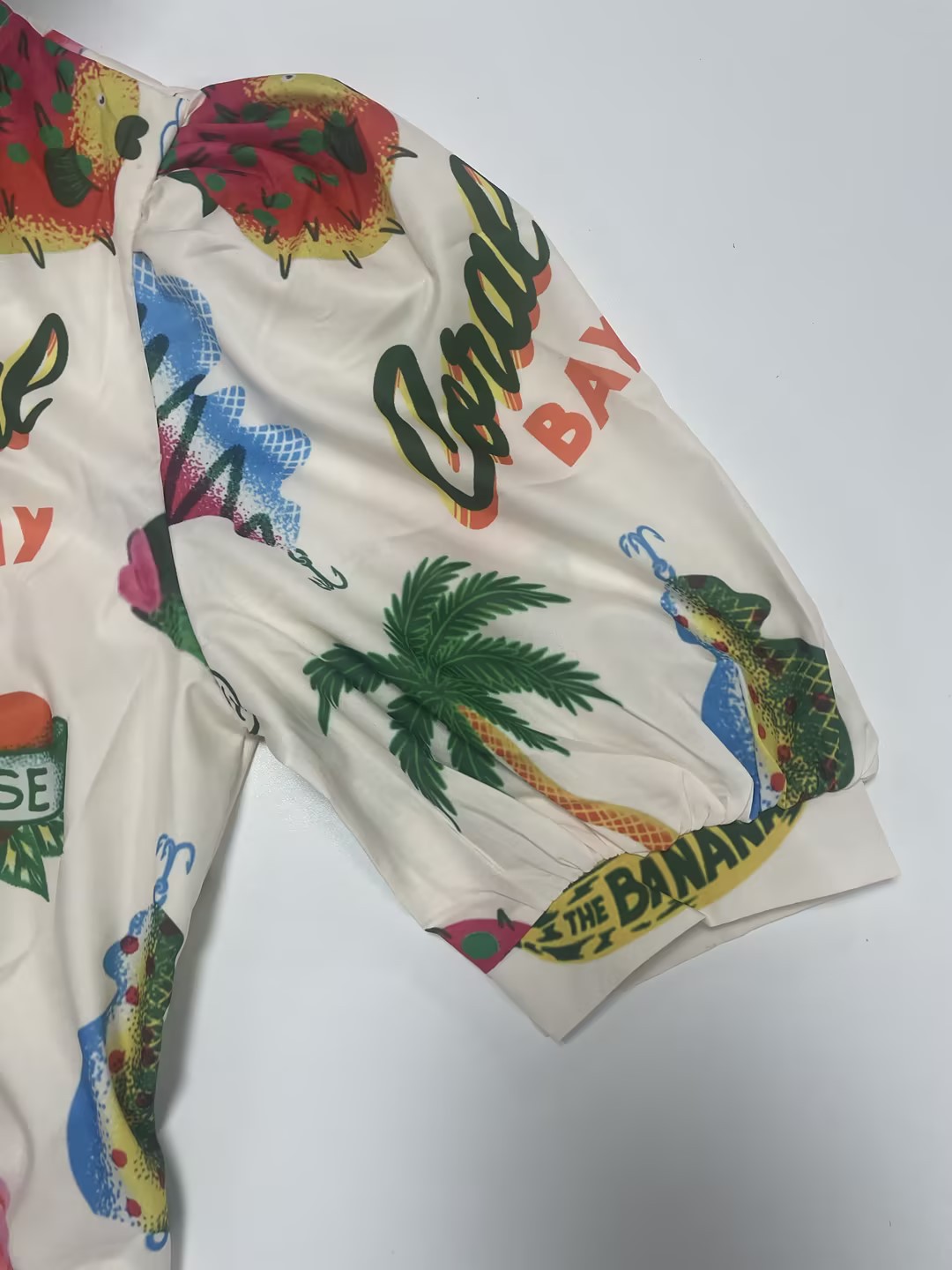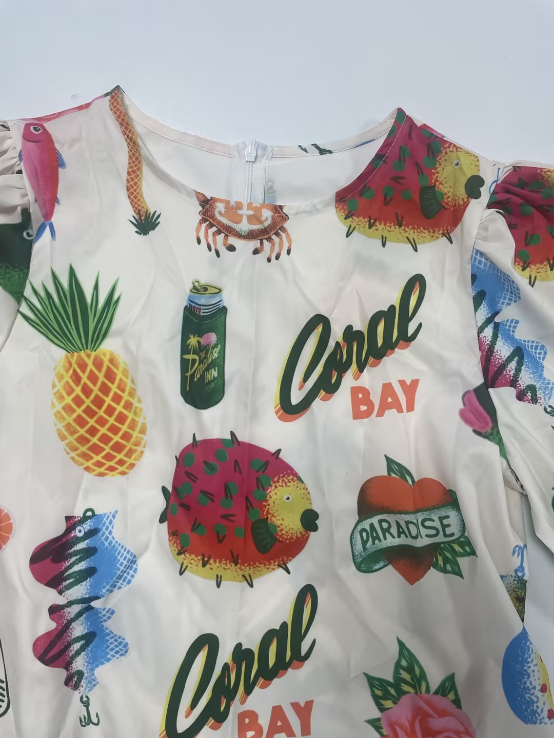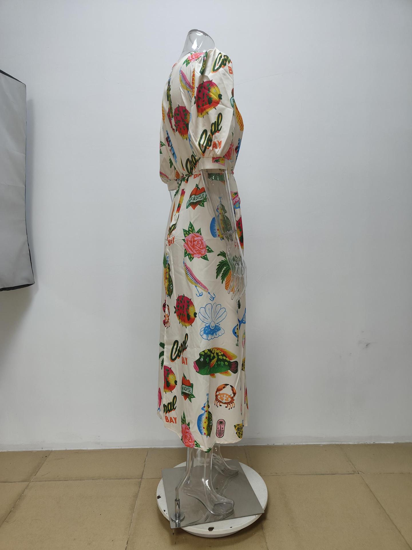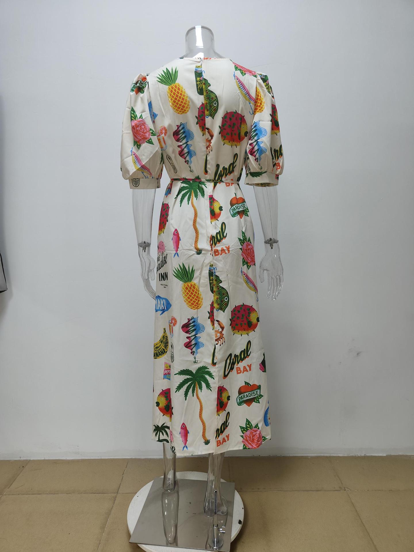 Summer Women Clothing Printed Puff Sleeve Pocket Belt Mid Length Dress