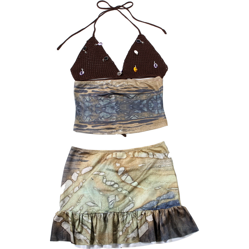 Summer Women Clothing Sexy Backless Small Tube Top High Waist Printed Skirt Set Women
