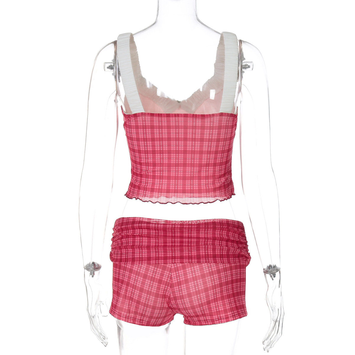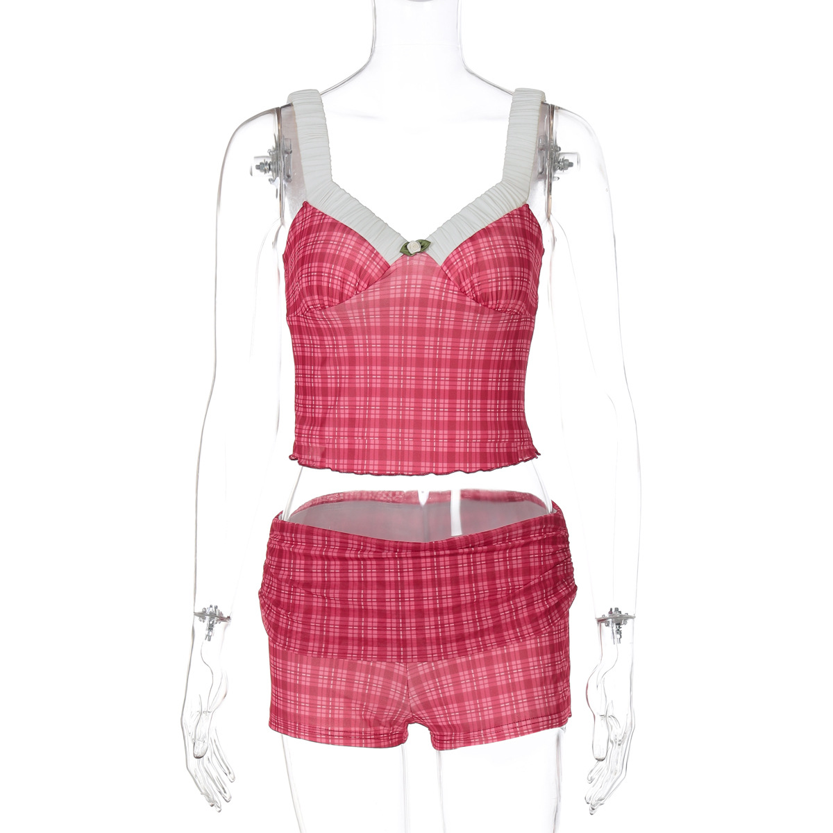 Women Clothing Spring Patchwork Contrast Color Wooden Ear Small Tank Top Tight Shorts Set