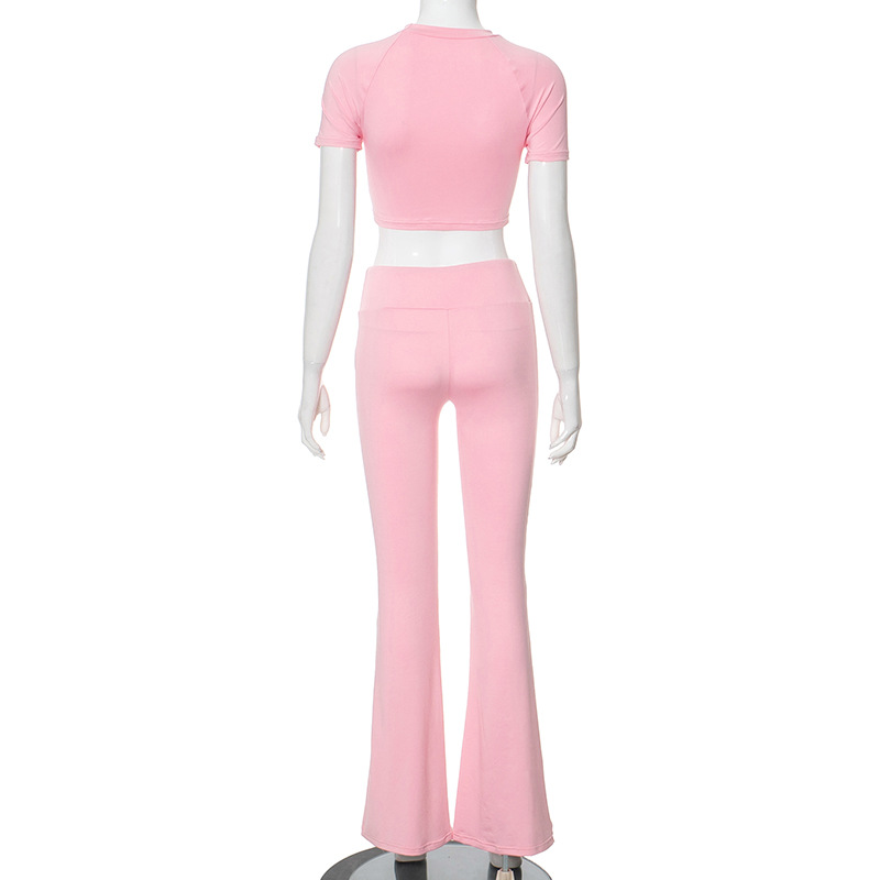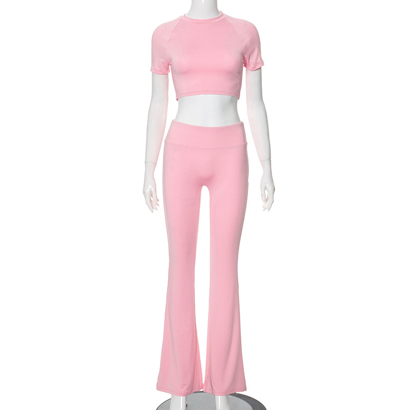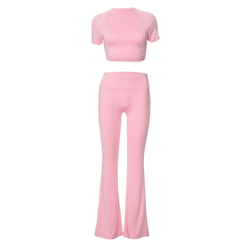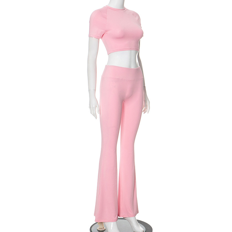 Women Clothing Summer Short Sleeve round Neck Short Top Elastic Waist Pants Casual Two Piece Set